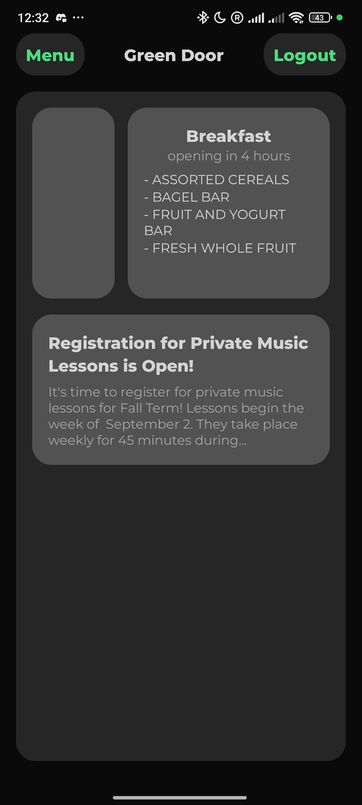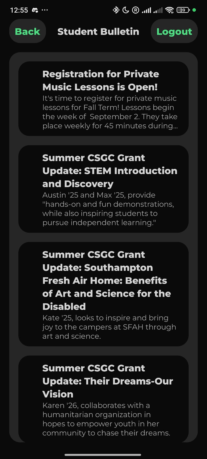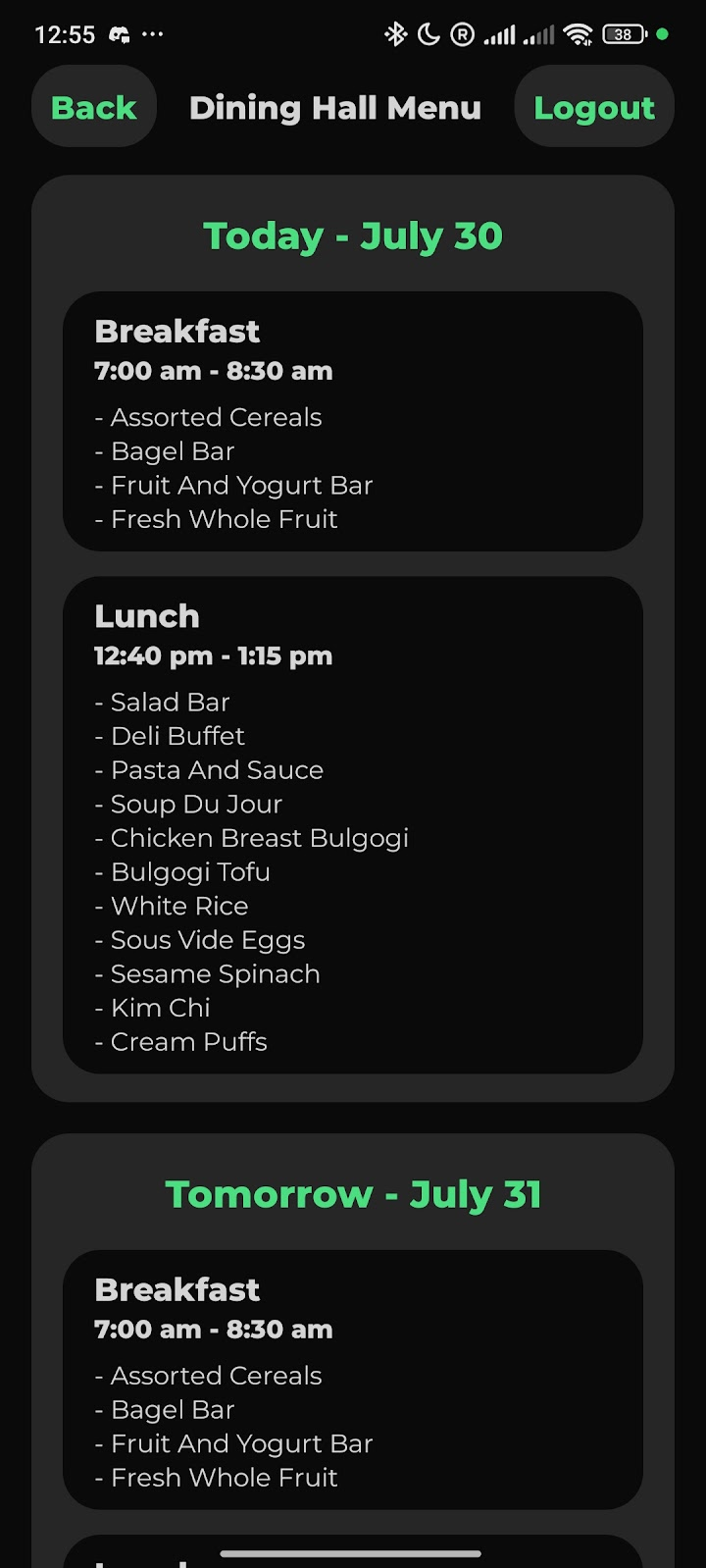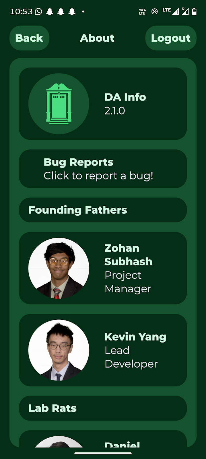 We presented our work to the Head of ITS, who mentioned an unwritten student app development policy that “prohibited all student developed apps”. Due to our impressive work with the app, however, they modified the policy to allow the publishing of apps that have been approved by ITS. They did not want any personally identifiable data going through the app, however, so they suggested an app that displayed Dining Hall Menu, Athletic Schedules, Student Bulletin Posts, etc. Due to other commitments, our work on this new app never reached completion.