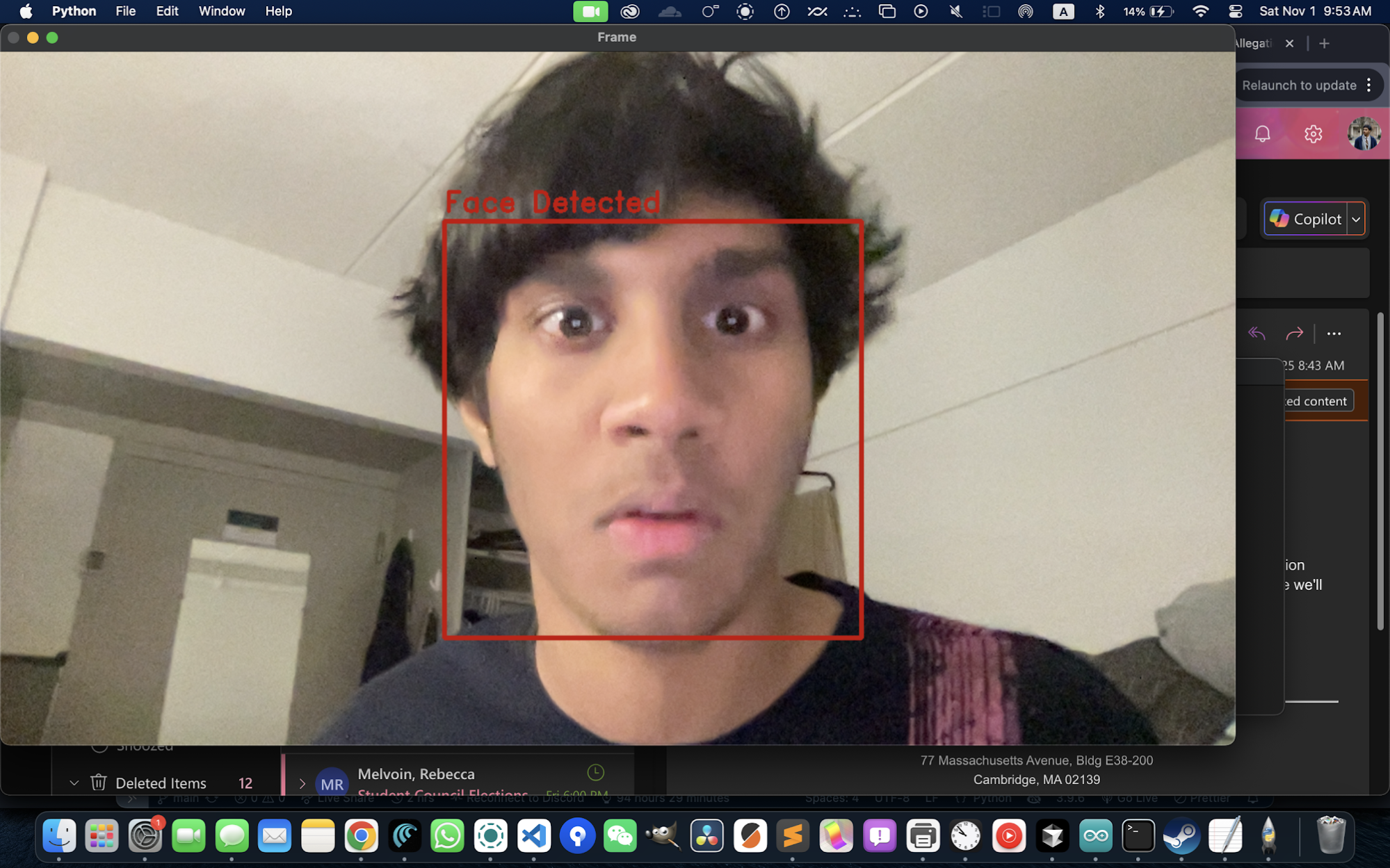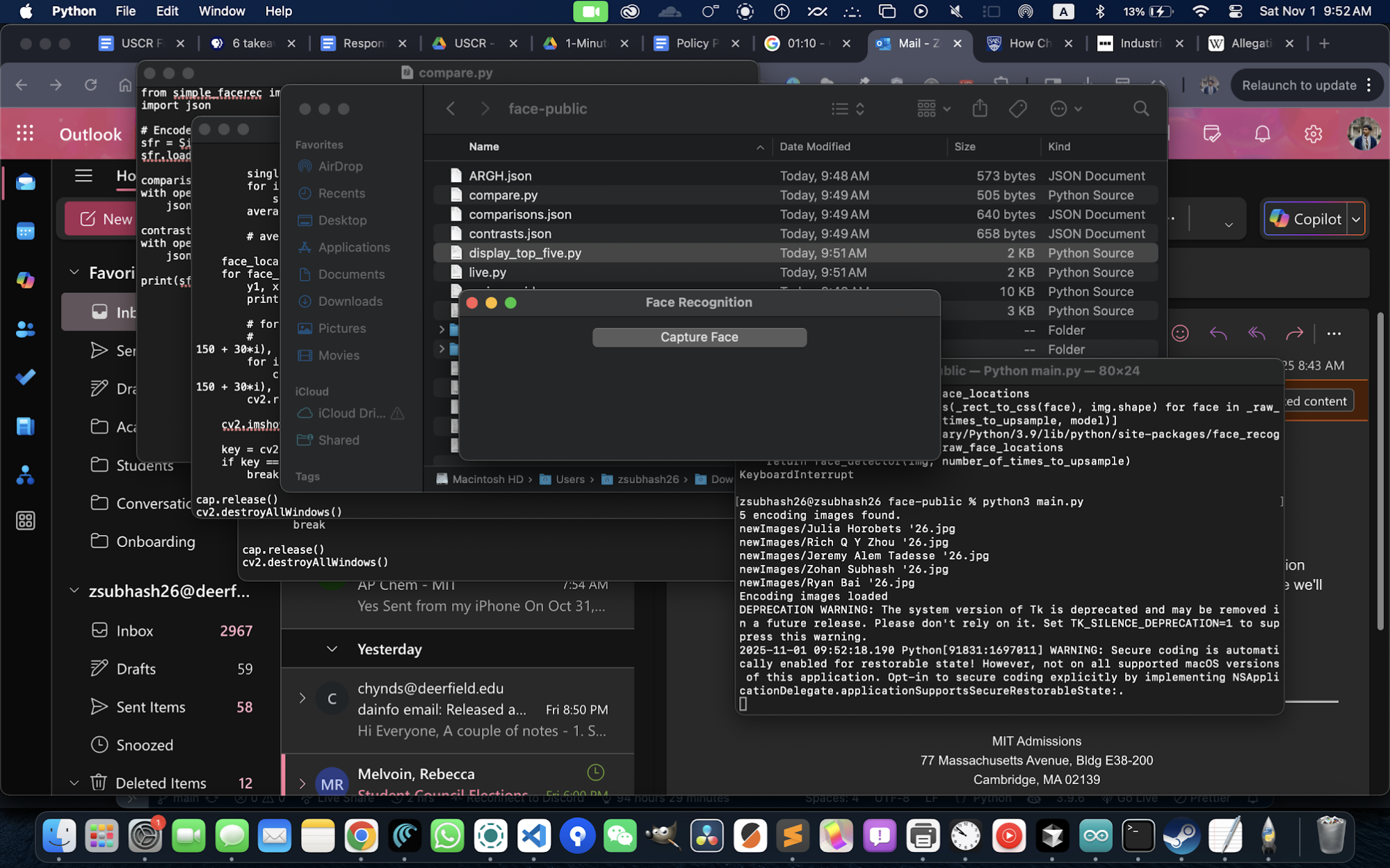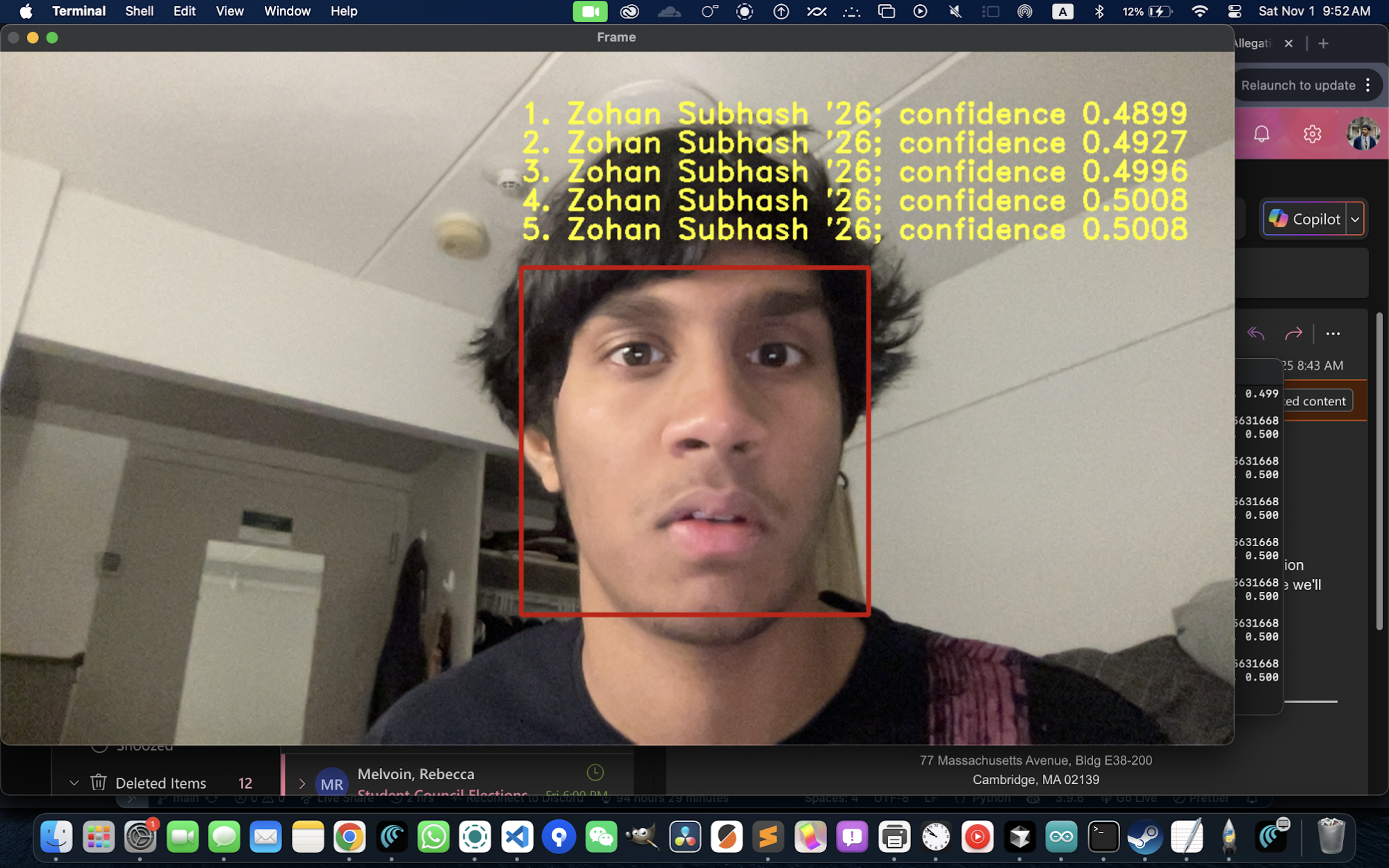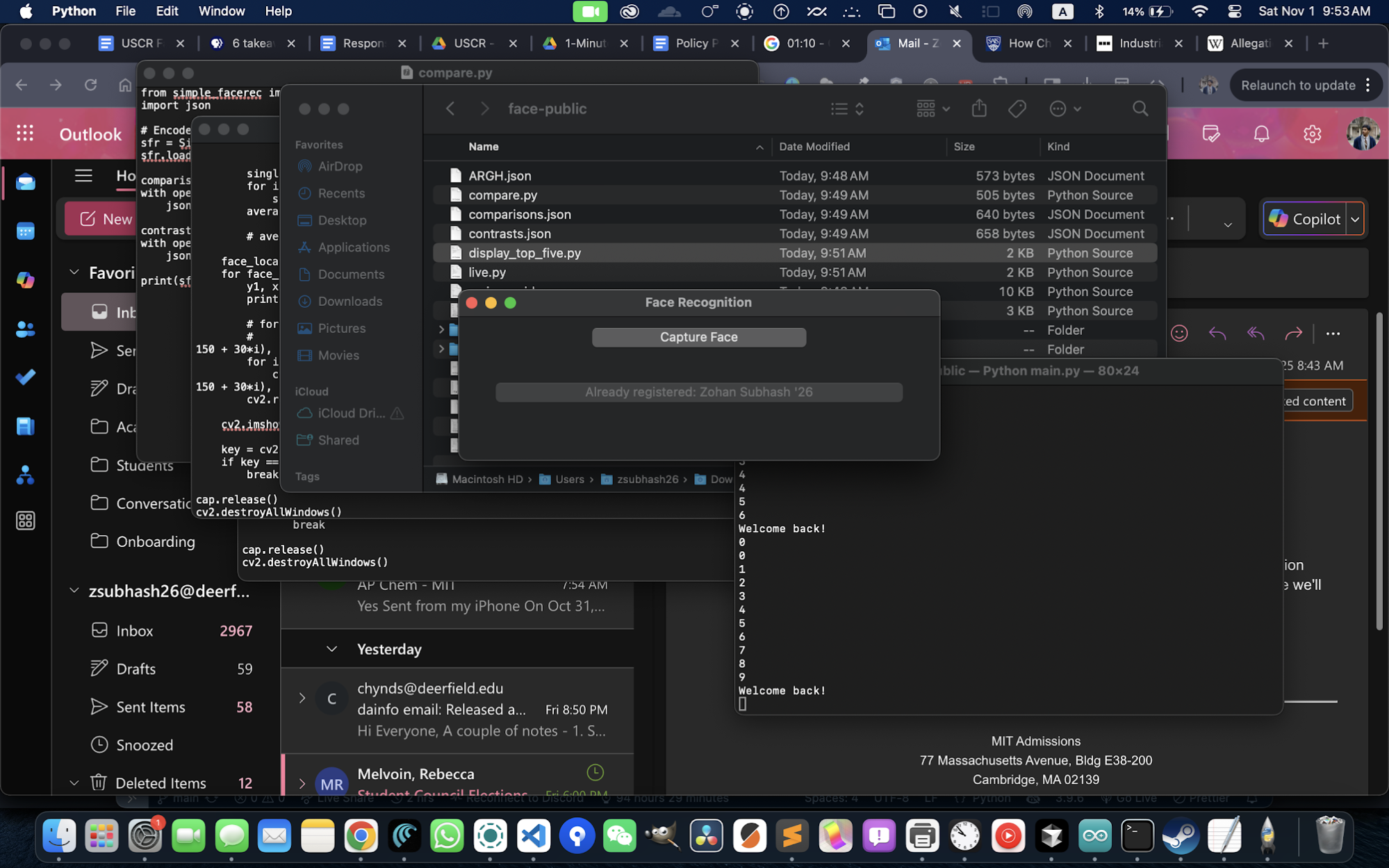 As a live demonstration intended to gain interest for the Computer Science Club at our Annual Club Fair, I developed a simple Python OpenCV face-recognition script trained on image data downloaded from DAInfo, that would automatically add recognized students’ emails to an email list with the click of a button. The script worked surprisingly well, notwithstanding the limited training data of one image per student. Due to concerns with the privacy of the students whose images were used to train the model, I was unable to use this program at the Club Fair.
