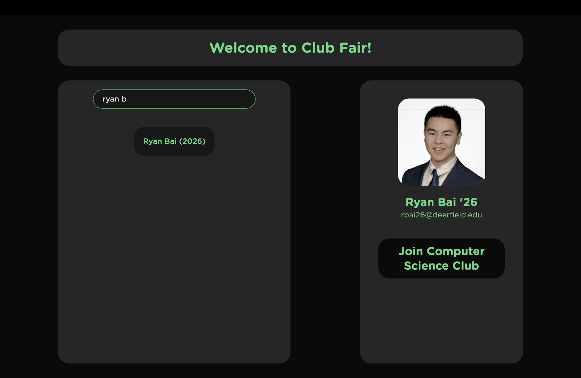 I therefore developed an alternative web application where students could search up their name and click “Join Club” to join the club. It used data from DAInfo. This program was very successful, and students enjoyed the convenience in comparison to the conventional method of using a spreadsheet to collect email addresses. Other clubs, alliances, and student organizations adopted it, and the web app has been in use for two years now.