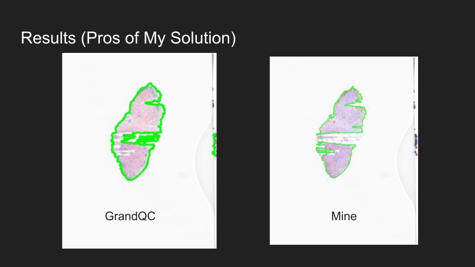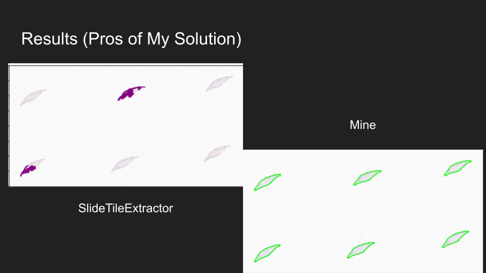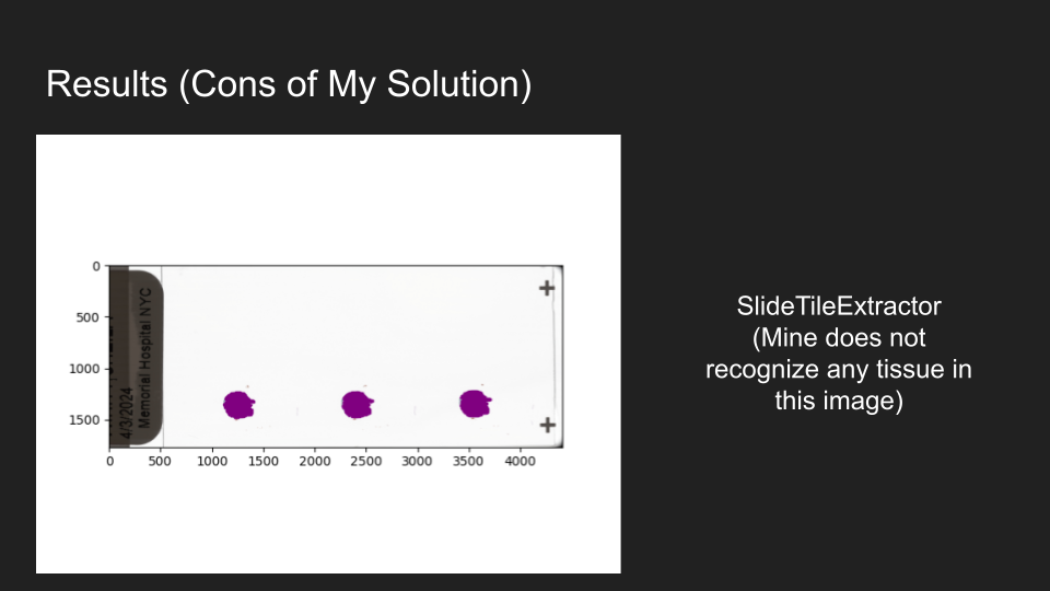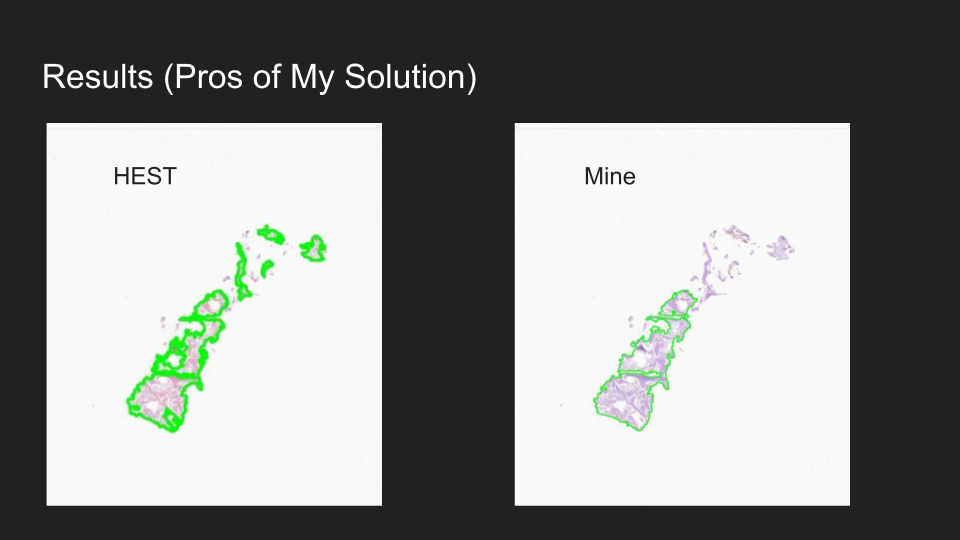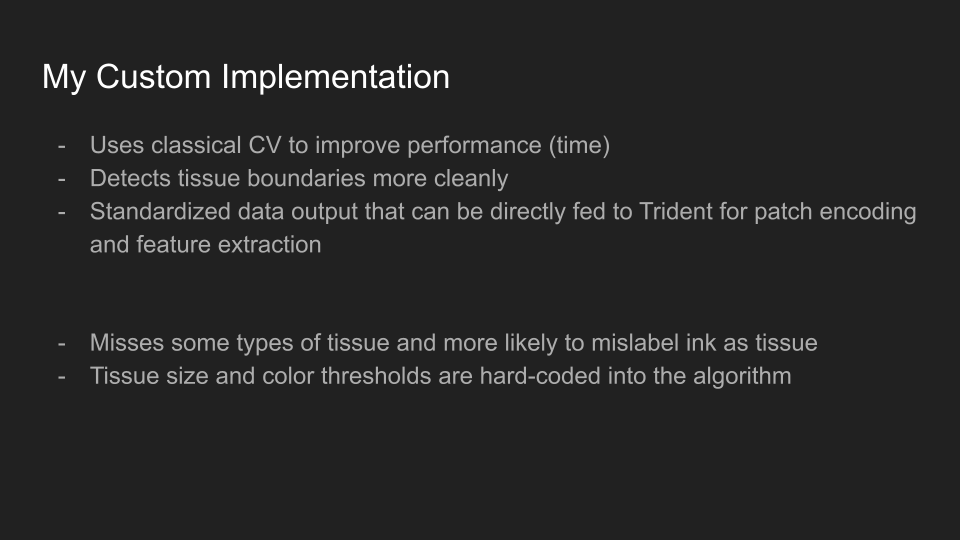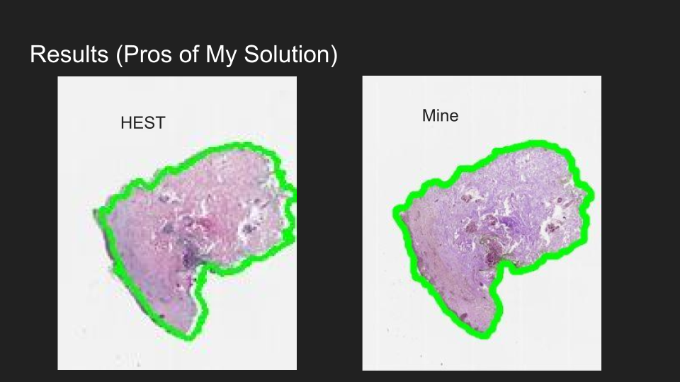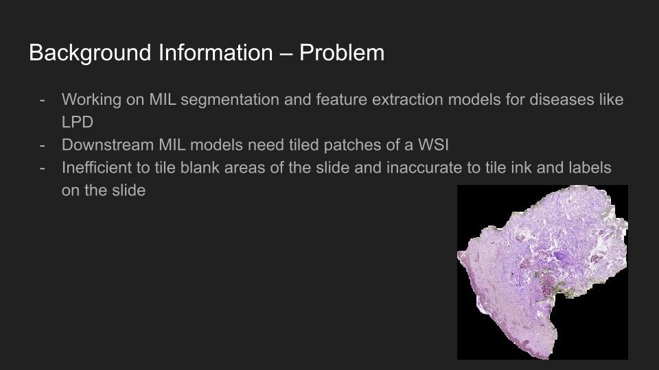 I asked to work on Whole Slide Imaging, which interested me the most out of the numerous problems the lab was working on. I was presented with a problem on WSI segmentation and tiling. One of the products they are currently working on uses Multiple Instance Learning to detect leukemias and lymphomas from slide samples of patients with lymphoproliferative disorders. The challenge I was tasked with solving involved the first step in this pipeline process. The tissues needed to be segmented and patched, meaning that I needed to split a whole side image into tiny tiles or patches of the tissues in that slide. This is because WSIs are often hundreds of thousands of pixels wide, and the machine learning models can only take images that are 256, 512, 1024, etc pixels wide. Tiling sections of the slide that are whitespace would be hugely inefficient, and tiling sections of the image with ink or writing could mess up the training process of the models downstream (only positive slides would have + symbols, for example). So I had to detect tissue and tile only those regions of the image. The current solution used was a Deep Learning library developed by the Mahmood Lab at Harvard (https://github.com/mahmoodlab/TRIDENT). It was very time consuming and not very accurate for our use-cases either. I was told to create an independent tool that could segment tissues from WSI and tile the WSI in a time efficient manner. I was encouraged to use classical computer vision.