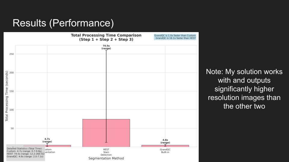 Through a lot of brainstorming, discussions with my mentor, and experimenting with Cursor, I developed a tool that worked surprisingly well, and better than my competitor in accuracy and performance efficiency. There were challenges I had to work around such as ink and dirt on the slides, but my tool managed to perform well against these adversaries.