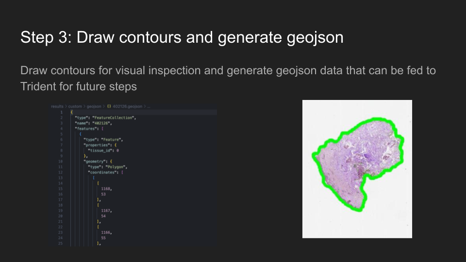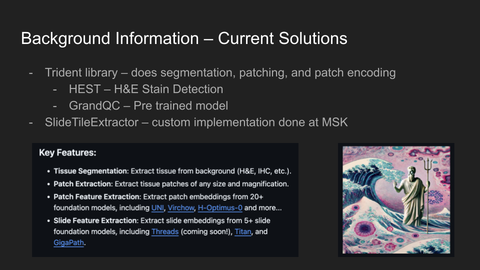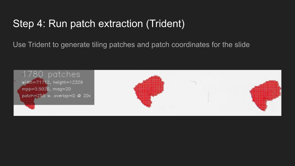 Trident is the Deep Learning implementation by the Mahmood lab, and SlideTileExtractor is an in-house implementation developed by someone at MSK. The latter, however, has many hardcoded variables such as tissue blob size and ink color, and does not work well for different types of slides.