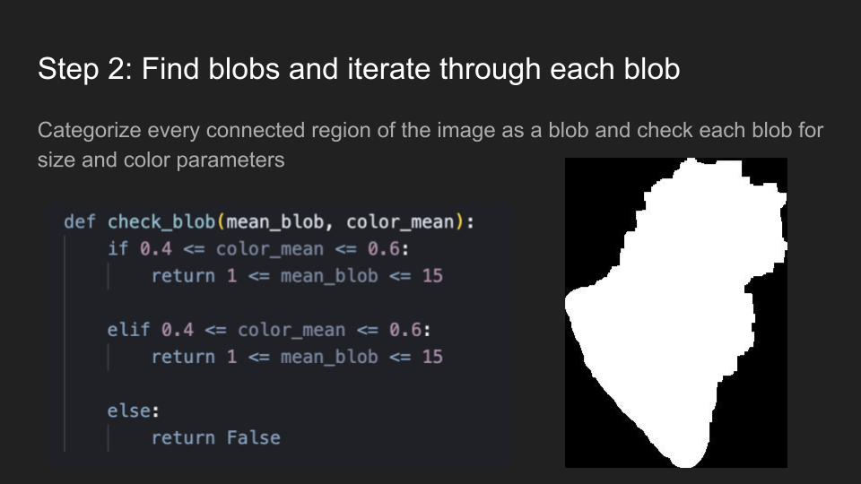 Then, I iterate through each blob in the image. I check the blob against some hard-coded conditions for size and color (hue, not saturation or value). I then draw contours and export the data in a format (geojson) such that the Trident library can then perform tiling on its own using the segmentation computed by my tool.